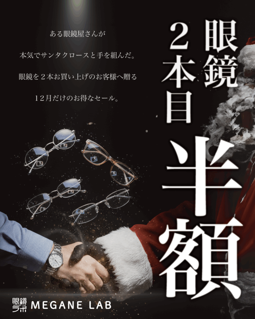 眼鏡ラボでは、12月1日(月)から31日(水)まで、メガネを2本同時購入いただくと2本目が【半額】になる特別なキャンペーンを開催します!